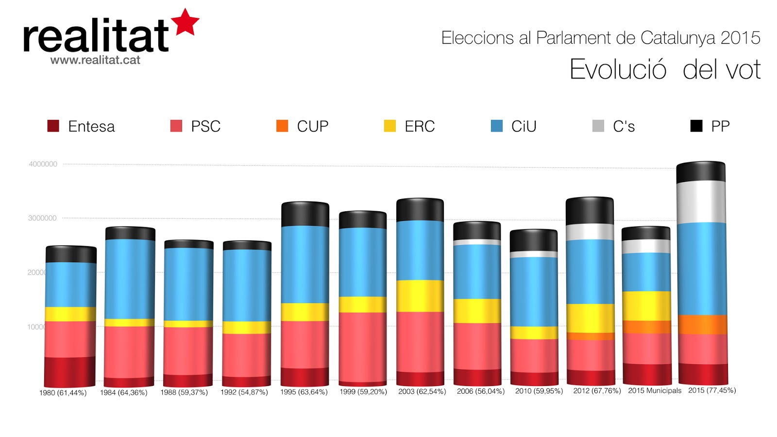 La coalició patriòtica de Junts pel Sí ha aconseguit reunir aproximadament els mateixos vots que CiU i ERC per separat el 2012, tanmateix, l’augment de la participació li suposa una pèrdua d’escons, de 71 a 62. Aquesta pèrdua es veu compensada pel creixement de la CUP, opció independentista que passa de 3 a 10 escons al Parlament i triplica els seus vots. No obstant això, la majoria independentista comporta una difícil governabilitat i situa el Procés Sobiranista novament al punt d’inici: és una opció majoritària però no disposa de suficient força ni cohesió per a impulsar un procés definitiu.