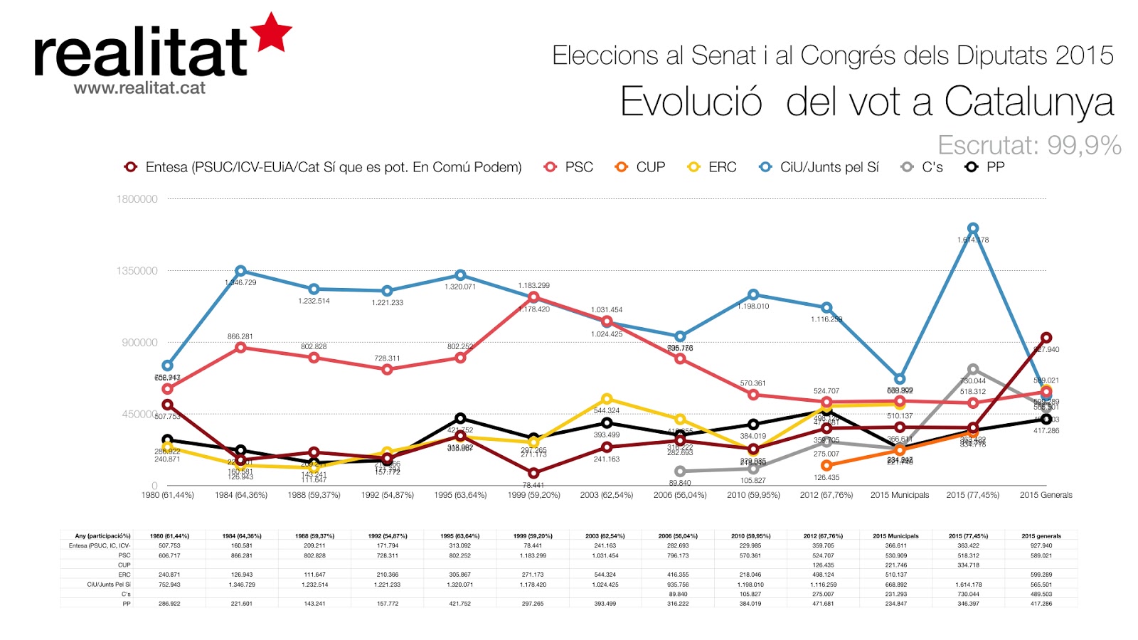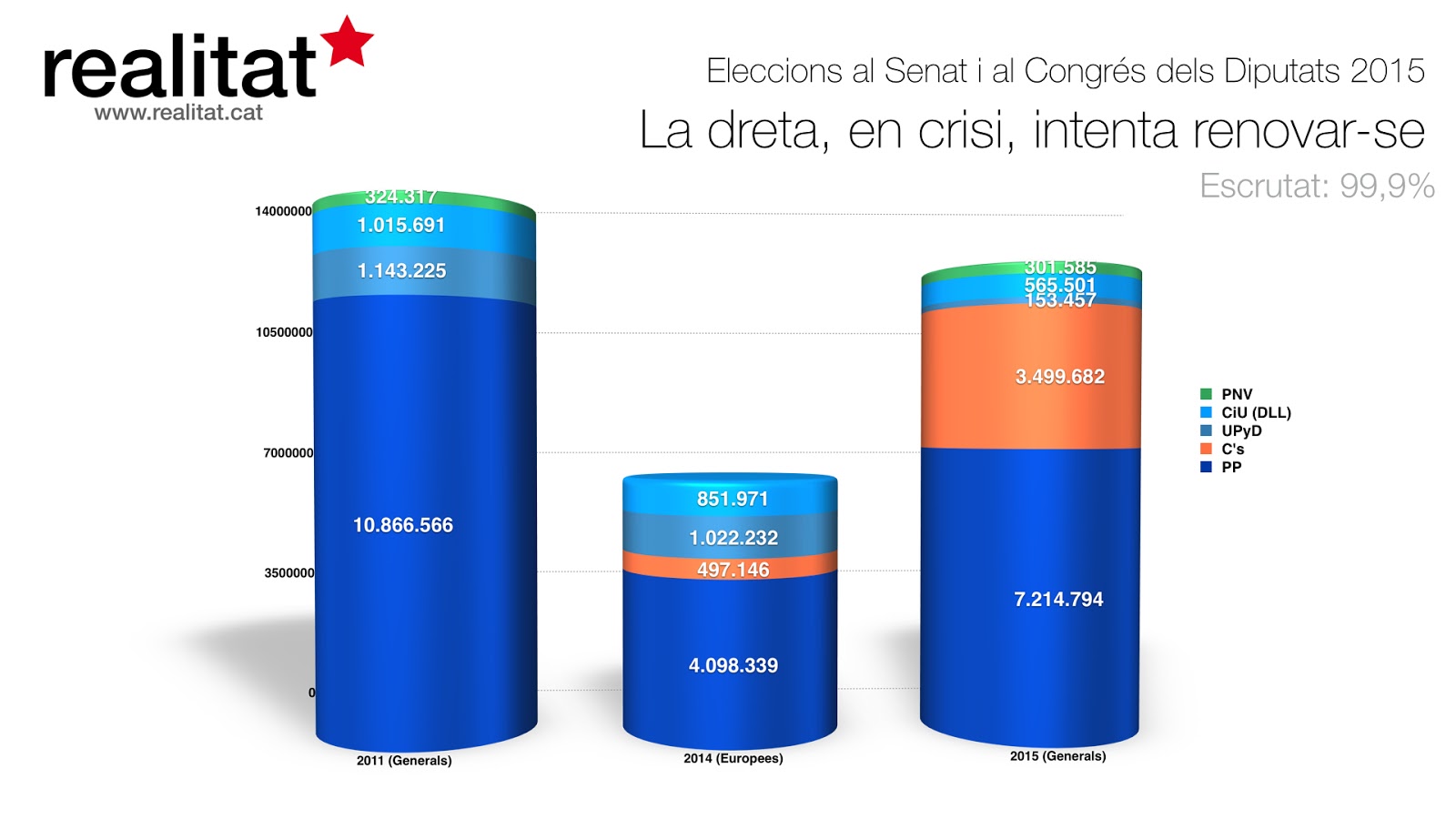 La dreta està en crisi: perd vots i es divideix. La major caiguda en vots és la del PP, seguida de la de CIU, que proporcionalment és molt més forta. Els vots de la dreta descontenta són recollits només parcialment per Ciudadanos que puja però molt per sota de les enquestes. La campanya mediàtica en favor del recanvi del règim sembla haver fracassat.