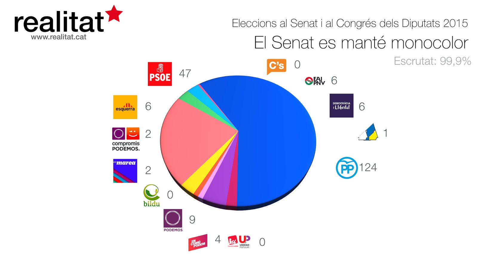 A diferència del Congrés dels Diputats, en el Senat es manté la tònica bipartidista o, més aviat, monocolor, amb una victòria rotunda del PP amb 124 senadors/es enfront dels 47 del PSOE. Ciutadans no obté cap senador. Cal destacar la irrupció al Senat d’En Comú Podem amb 3 senadors/es per Barcelona i 1 per Tarragona i la caiguda del PSC.