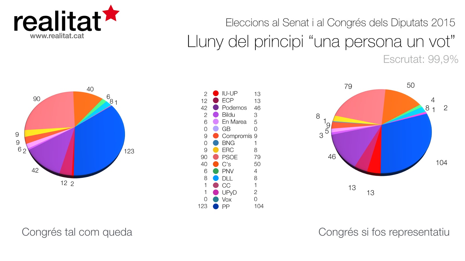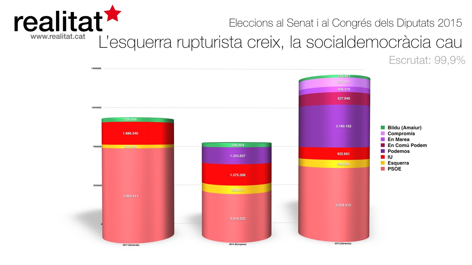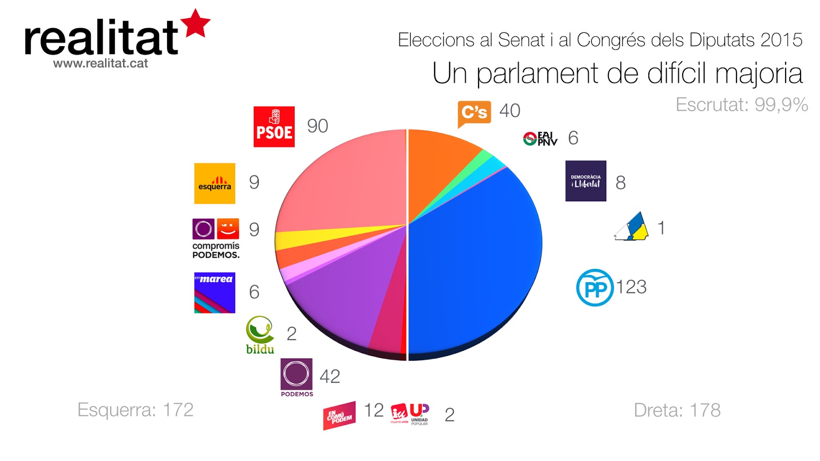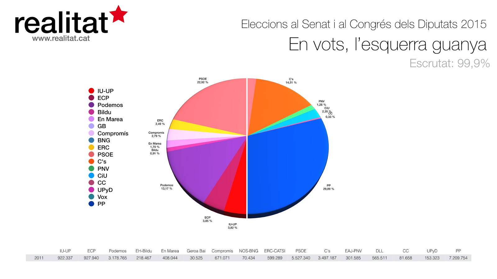 En números totals, l’esquerra ha guanyat les eleccions al Congrés dels Diputats. La suma de vots a candidatures autoproclamades d’esquerres és superior a l’obtinguda pels partits de dreta. PP i PSOE segueixen sent els partits més votats però el bipartidisme mostra símptomes d’un enfonsament definitiu, amb el creixement de Podemos i les candidatures de confluència, que se situen com a tercera força. Ciutadans es consolida com a quarta força però molt per darrere de les seves expectatives inicials. IU resisteix el context difícil amb dos diputats per Madrid, després d’una gran campanya d’Alberto Garzón. El Congrés esdevé més plural i es veu abocat a una major discussió entre forces.