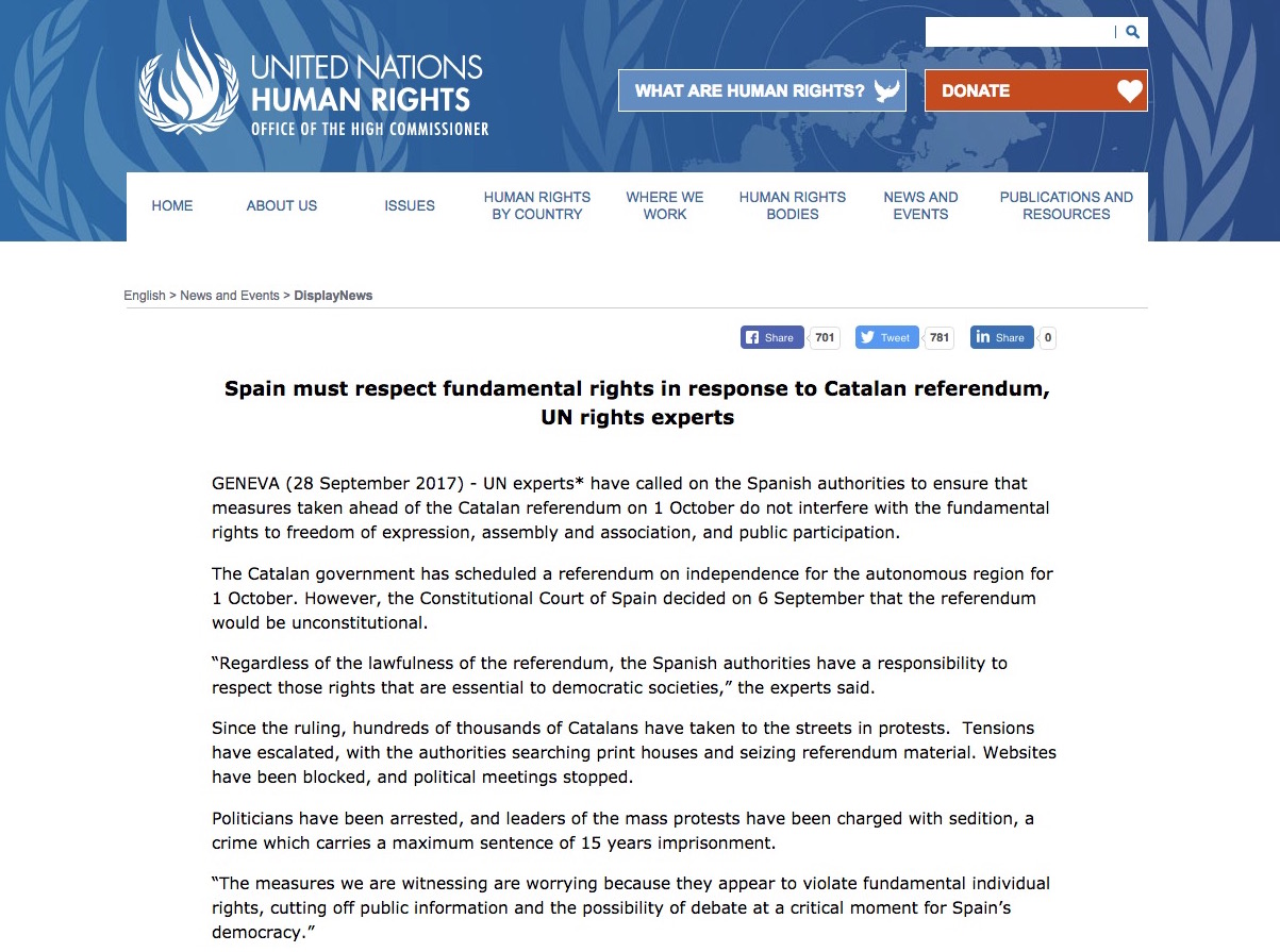 Experts de l’ONU han sol·licitat les autoritats espanyoles que “les mesures adoptades davant del referèndum de Catalunya l’1 d’octubre no interfereixin amb els drets fonamentals de la llibertat d’expressió, assemblea i associació, i participació pública”.