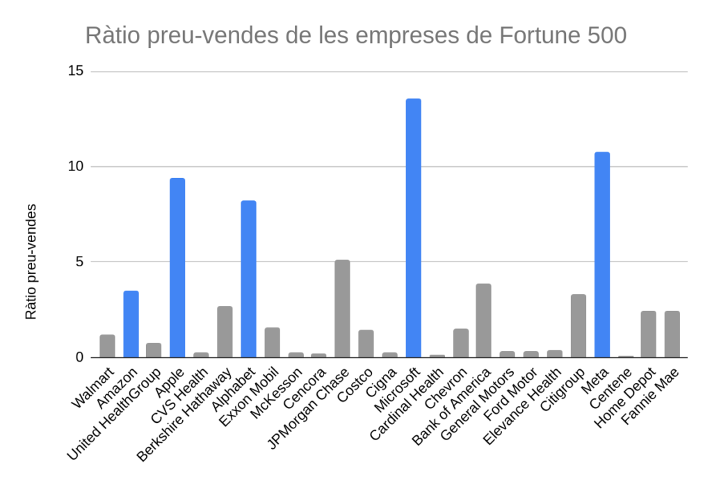Font: elaboració pròpia amb les estadístiques de les primeres 25 empreses del rànquing Fortune 500 amb la seva ràtio preu-vendes, setembre de 2025.