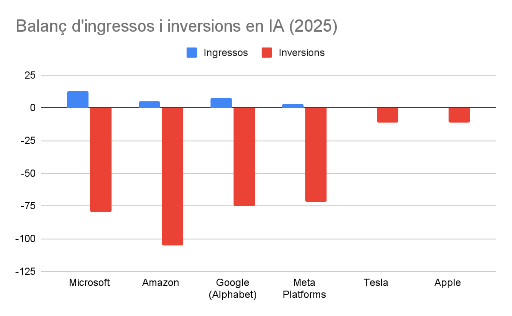 Actualment, la indústria de la IA té resultats desastrosos. Cada nou model té un cost d’entrenament enorme. Entrenar ChatGPT 4 va costar més de 100 milions de dòlars, i el cost de ChatGPT 5 podria haver superat els 1.000 milions. Un cop en funcionament, el cost de funcionament també és prohibitiu, ja que els models són cada cop més grans. Per atraure els usuaris, les empreses d’IA com OpenAI, Microsoft, Google i Anthropic subvencionen els preus, entomant enormes pèrdues. L’analista especialitzat en IA Ed Zitron calcula que només el 2025 les grans tecnològiques han invertit de 354.000 milions de dòlars mentre que la projecció d’ingressos és de poc més de 28.000 milions.