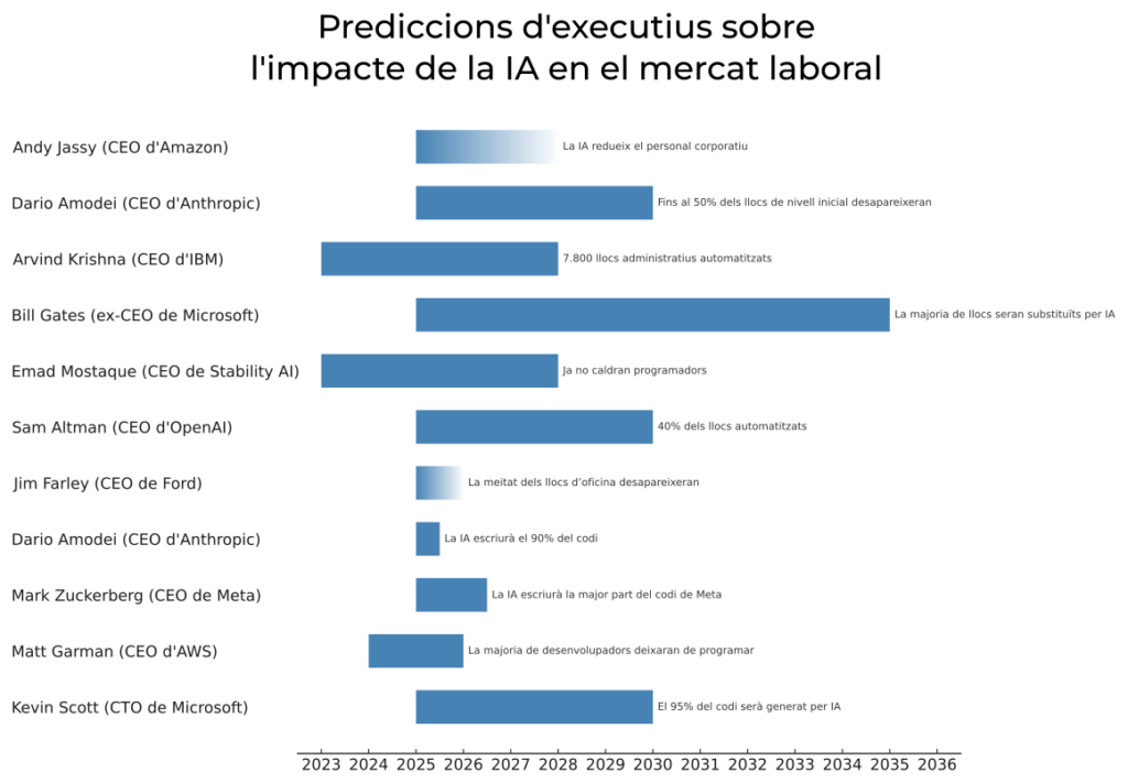 Els mateixos que prometien que el futur era el “metavers”, o que els cotxes conduirien sols, ara ens prometen que la IA ens substituirà a tots. Les estadístiques mostren canvis localitzats, per exemple en sectors com l’atenció al client, però no una substitució massiva. L’èxit dels projectes on s’han substituït treballadors per IA és discutible, i donaria per un altre article. El que sí que s’ha observat és un efecte d’histèria col·lectiva: els mitjans reprodueixen acríticament les promeses dels executius, els treballadors creuen que estan a punt de ser substituïts per un robot, i els inversors pressionen altres empreses a “no quedar-se enrere”, encara que això impliqui integrar la IA en productes on no té sentit i de forma matussera.