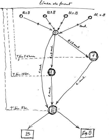 Com el Dr. Broggi ens recordava, una guerra és una gran catàstrofe on hi ha una gran desproporció entre els mitjans disponibles i les necessitats reals d’assistència. Els serveis mèdics de les Brigades Internacionals van posar en pràctica moltes de les estructures sanitàries que la bibliografia actual d’emergències i catàstrofes proposa com a necessàries. Un exemple el tenim en el gràfic elaborat pel Dr. Broggi que es mostra a continuació, com a esquema organitzatiu dels serveis sanitaris al front. En aquest es poden observar 4 àrees funcionals de salvament en el front de batalla que drenaran un lloc mèdic avançat (C), que està connectat amb l’Auto Chir (1) i que deriva pacients a un centre mèdic (2) o a altres hospitals de referència. Les distàncies estan determinades en hores de trajecte, no en quilòmetres, que condicionaven el triatge.