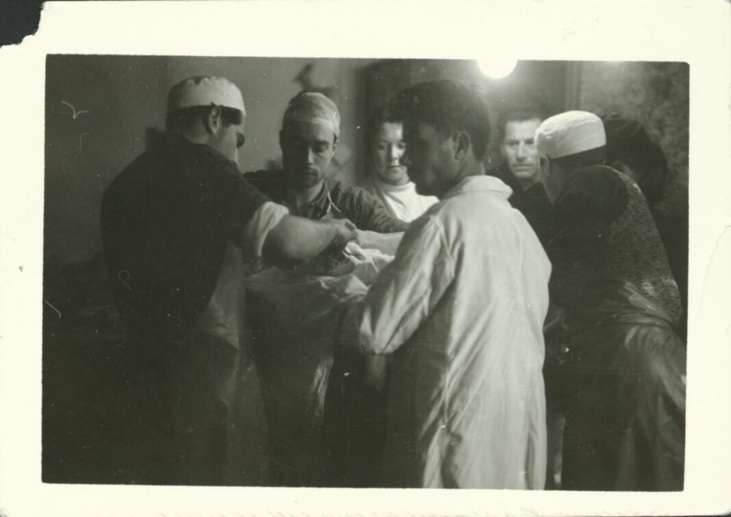La imatge que encapçala aquest article mostra el Dr. Broggi, en el centre, en una intervenció quirúrgica d’un trauma facial, a Cedrillas en el front de Terol (setembre – octubre de 1937).